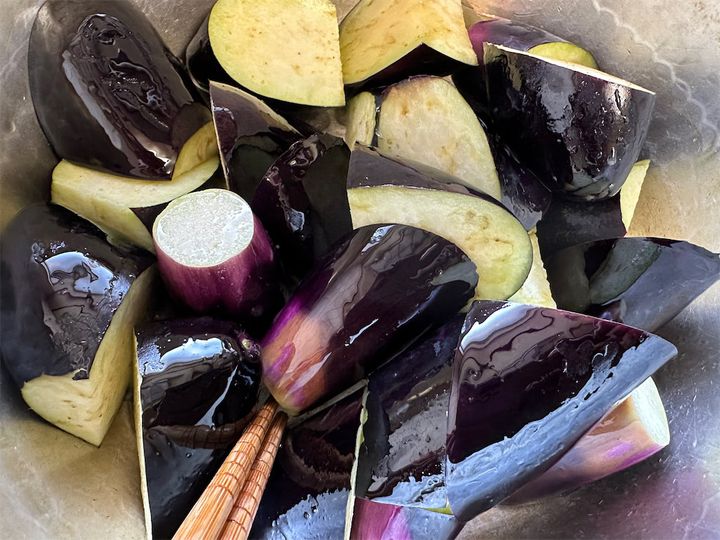 なすをカットしたら、さっそく調理スタート。ツヤっと照りが出るくらいまで、なすを炒めます。
