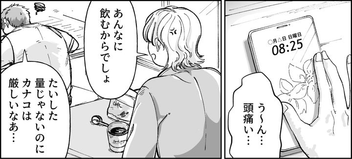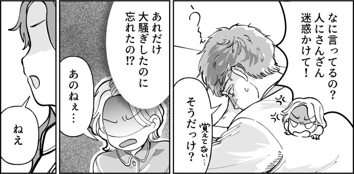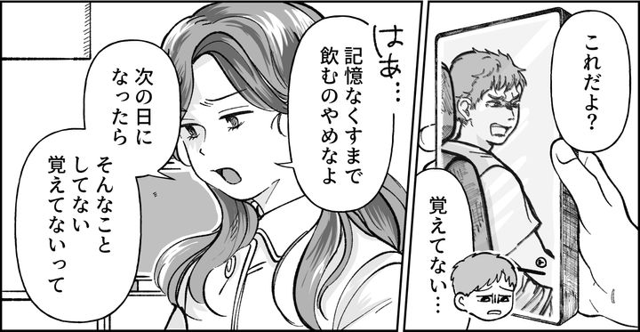 私はカナコ。夫ヨシヒロと高校生の娘ホマレ、小学生の息子タケルとの4人暮らしです。私たちはホマレのお祝いで家族そろって焼肉店に行きました。ただヨシヒロは酒グセが悪くて、飲むと記憶をなくすのです。調子に乗ってビールをたくさん飲んだヨシヒロは、すっかり酔っ払って大声で店員さんに絡みだす始末……。まわりに迷惑をかけ、子どもたちにも嫌な思いをさせてしまったのです。私は翌朝、きちんと話し合いをしなくてはと思いヨシヒロに声をかけました。