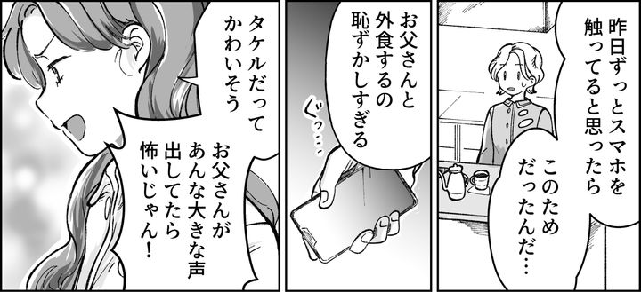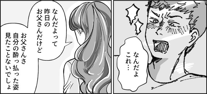 「どうしてこんなの撮ってるんだよ……」自分のありのままの姿を知ったヨシヒロは絞り出すように声を出しました。ホマレはヨシヒロを叱りつけます。「お父さん、酔うといつもこんな感じだよ? タケルがかわいそうでしょ!」