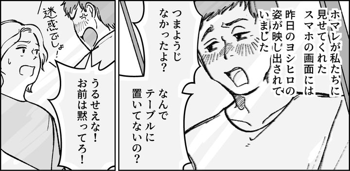 ホマレが差し出したスマホの画面には、昨日のヨシヒロの姿が映しだされていました。「つまようじがない」とブツブツ言ったり、店員に「なんでテーブルに置いてないの?」と絡んだり、私に対して「うるせえ黙れ!」と叫んでいたり。ホマレが焼肉店でずっとスマホをいじっていたのは、迷惑行為をヨシヒロに自覚してもらうためだったのでしょう。