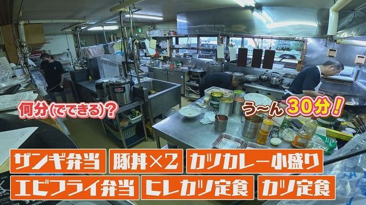 スタッフ:「ザンギ弁当・豚丼2つ・カツカレー小盛り・エビフライ弁当・カツ定食、何分?」