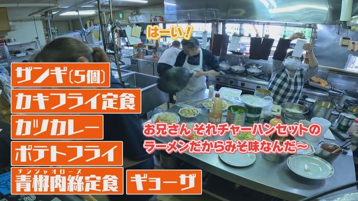 スタッフ:「青椒肉絲定食・ポテト・カツカレー・カキフライ定食・ザンギ5個・ギョーザ。お兄さん、それチャーハンセットのラーメンからみそ味なんだ~」マスター菅野さん:「は~い」