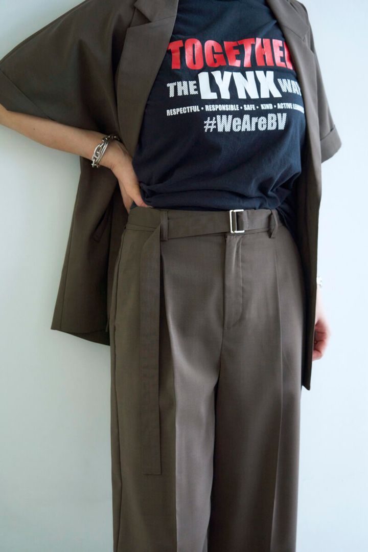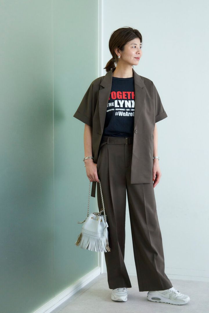 トーンを抑えたジャケット&パンツのセットアップ。「週初めなのでちょっと気合を入れたジャケットスタイルにしました」と森さん。真夏日でも涼しく快適に着られるように「このセットアップは裏地がなくてとても軽いんです。大人世代が気になる二の腕やお尻がかくれる丈感で、体形カバーもできます」(森さん)。ワンタックに共布ベルトのついたパンツも、シルエットがすっきりと見えます。アクセントには「ヴィンテージのロゴTシャツをインに着ました」と森さん。オフィスコーデにヴィンテージをミックスさせると、こなれ感が出ます。