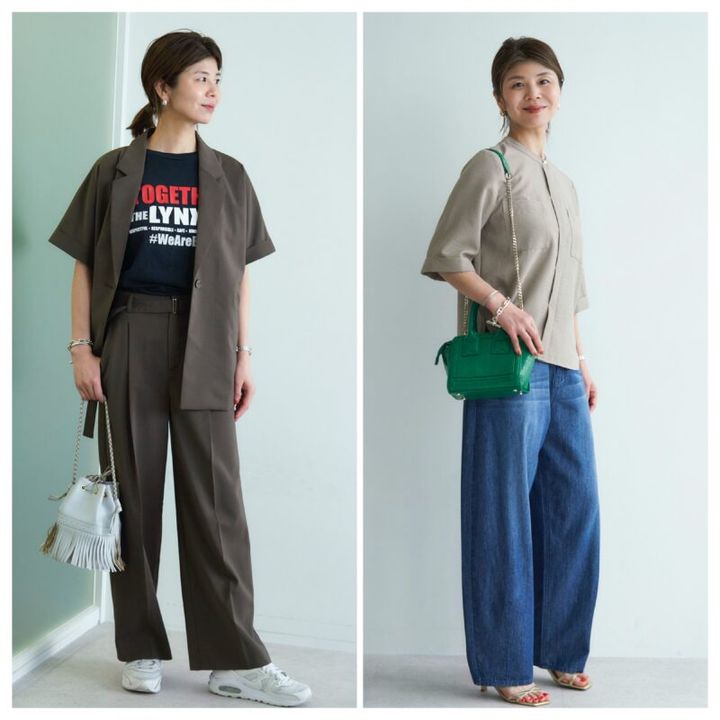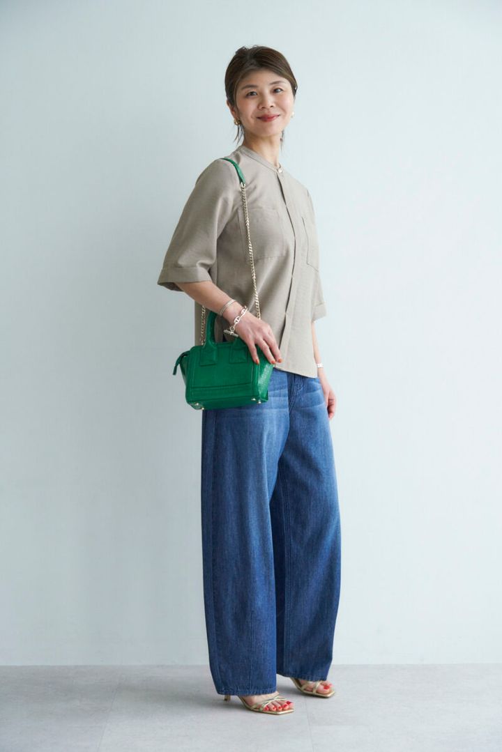 ひじが隠れるハーフスリーブのシャツは、シワになりにくいリネンのような素材です。「バンドカラーに両側のポケットがアクセントになっています。チャコールやベージュなど4色展開のなか、デニムカラーとなじみのいいモカを選びました」(森さん)。ボトムスのワイドシルエットのパンツは「一見デニムに見えますが、デニム加工した素材です。接触冷感になっているので、はいていることを忘れるくらい柔らかくて軽いんですよ」と森さん。ワイドシルエットがルーズに見えないように、ヒールのあるサンダルでバランスをとりました。