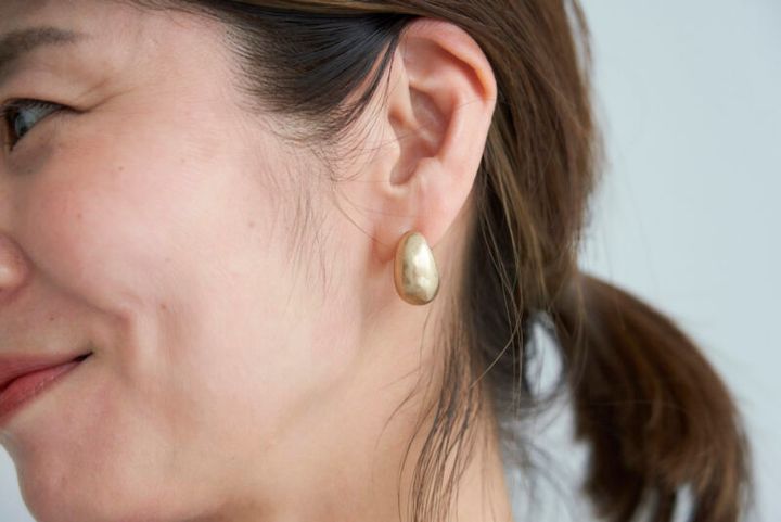 ゴールドのころんとしたフォルムのピアスは、「サンダルのゴールドとリンクさせました。これ、スリーコインズで買ったんですよ」と森さん。モカベージュ色のシャツにゴールドが映えます。