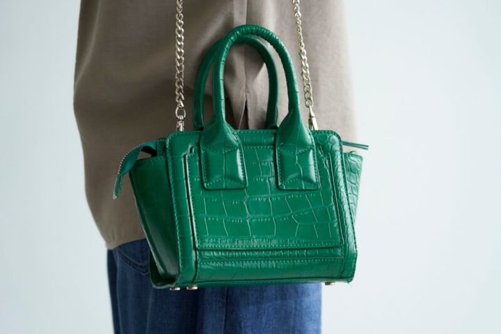 「フェイクレザーなんですが、このきれいなグリーン色にひとめ惚れ。即決しました」と森さん。チェーン付きのミニバッグは、落ちついたトーンのコーデを華やかに見せます。