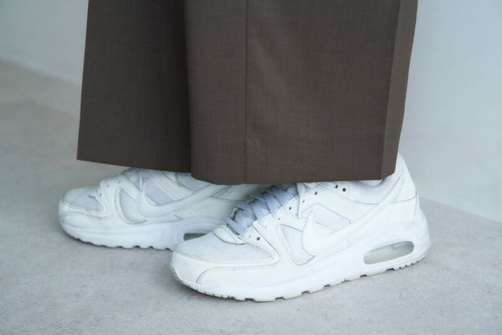 「ヒールのある靴を合わせるとコンサバっぽくなるので、足元はカジュアルな白スニーカーにしました」と森さん。ソールアップタイプを選ぶと、タックパンツとのバランスも◎。