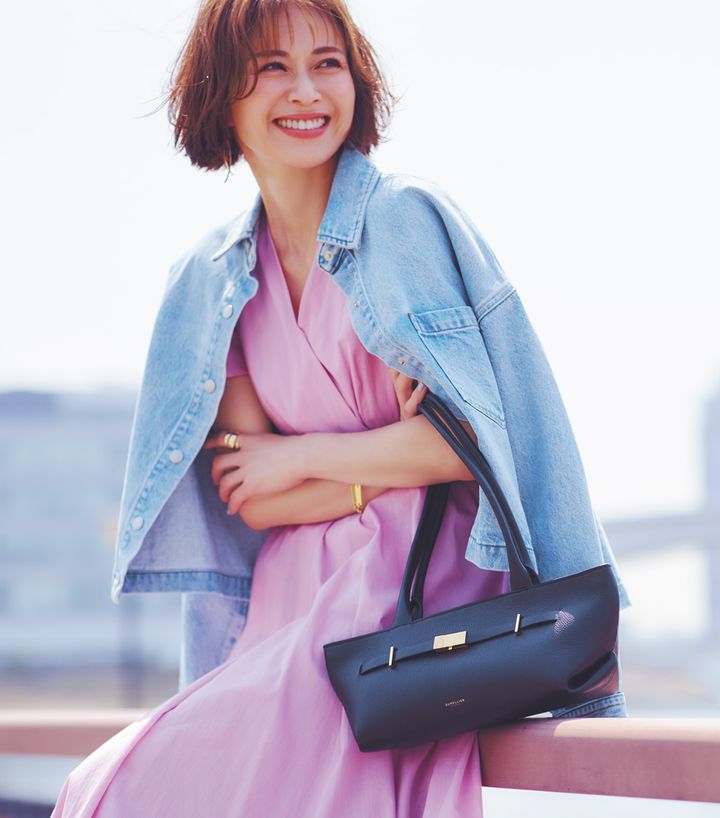 ワンピース¥38,500(マリハ)デニムジャケット¥44,000(THIRD MAGAZINE)バッグ¥85,800(デメリエー/ハウント代官山/ゲストリスト)サンダル¥39,600(イル サンダロ オブ カプリ/オデット エ オディール 新宿店)ピアス¥148,500〈ウノアエレ〉ブレスレット¥23,100リング¥14,300〈ともにワンエーアールバイウノアエレ〉(すべてウノアエレ ジャパン)