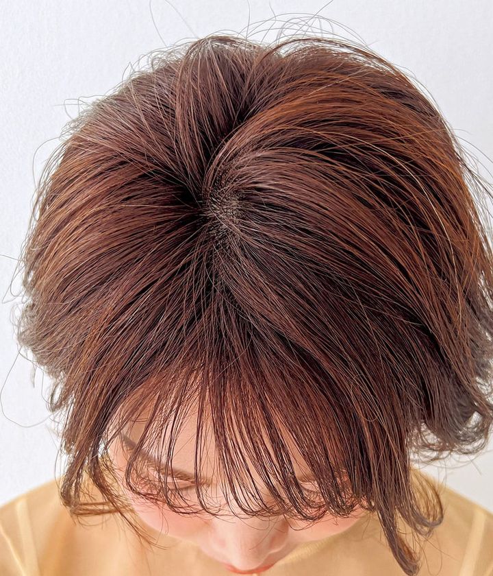 分け目がハッキリしているため根元の白髪が一目瞭然で、こめかみから耳にかけても、直線的ラインで白髪が覗き、老けた印象だったという杉田さん。そこでトップは薄めにレイヤーを入れ、地肌をカバー。耳周りはインナーレイヤーを入れることで生え際が曖昧になり、白髪が伸びても目立たない若々しいフォルムに。