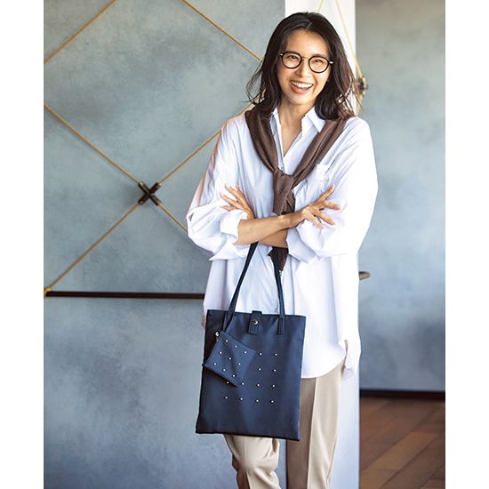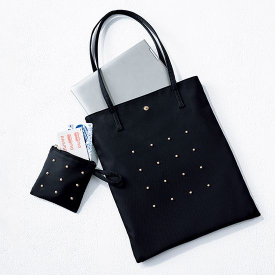 光沢のある素材にゴールドスタッズが付いたデザインで高見えします。内側には頑丈な生地を張り、深い内ポケットがあるので、パソコンと書類などを分けて収納可。軽量なので肩がこらないのも◎。ミニポーチ付きなのも嬉しいポイント。