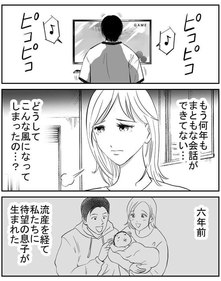 流産を経て授かった待望の息子。でも、息子がイヤイヤ期を迎えると夫は息子に関心がなくなり…夫婦仲は悪化。さらに最悪なことに、夫が働いていたお店が半年前に休業。仕事をせずにゲームばかり。夫はゲームに負けると機嫌が悪くなり、妻や息子のせいにして怒鳴っては息子を怖がらせます…。
