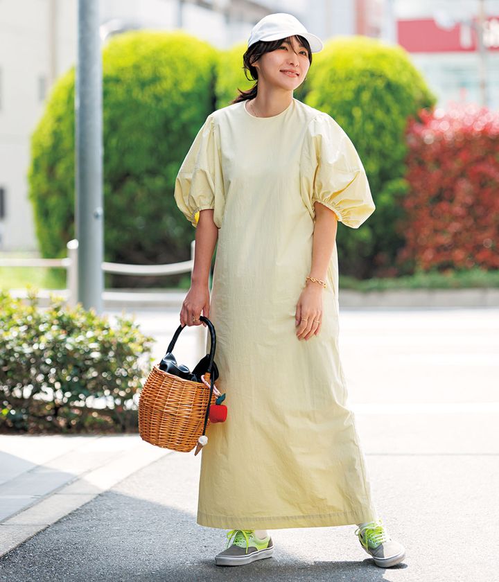 柔らかい色味とボリューム五分袖が可愛いワンピはAKTEのもの。スニーカーにもイエローを取り入れて、公園ファッションを満喫。