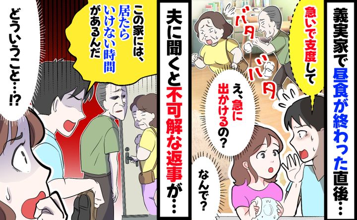 昼食後に慌てて出かけようとする義父母と夫「実家には居たらいけない時間がある」え…?衝撃の理由とは