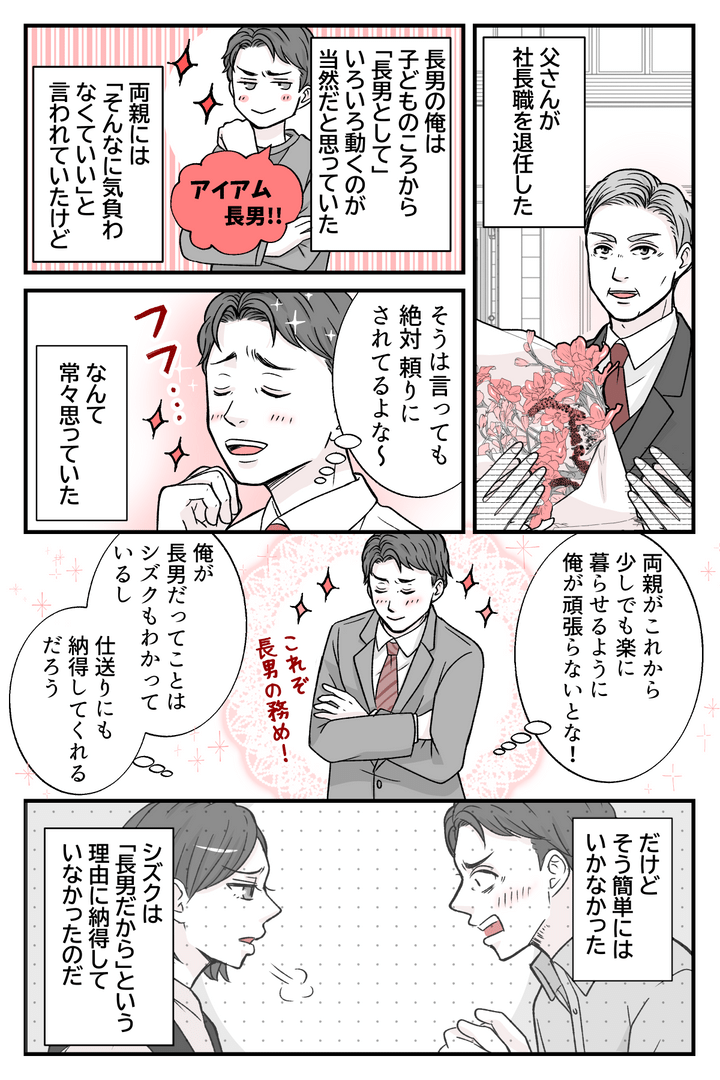 俺はマモル。最近父が退職して、俺は仕送りをしてやることにした。前々からそう決めてたんだ。だって俺は長男だから。事前に妻のシズクに相談はしていなかったが、その程度のこと、長男と結婚した時点でわかってたはず。きっと納得してくれるだろう。経済的にはちょっと痛手だが、両親も喜ぶだろうし頑張るしかない。長男の義務ともなれば、シズクだって喜んでパートを増やしてくれるだろう……なんて思っていた。しかし両親がうちに来て、俺はこっぴどく叱られた。