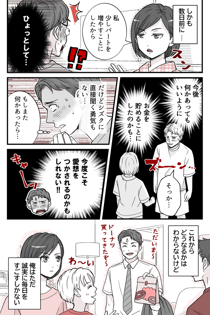 数日前、シズクがパートを増やすと言いだした。もしかしたら、俺に見切りをつけているのかもしれない。不安が募るが、聞く勇気もない。ただ誠実に毎日をすごそうと思う。俺にはそれしかできない。