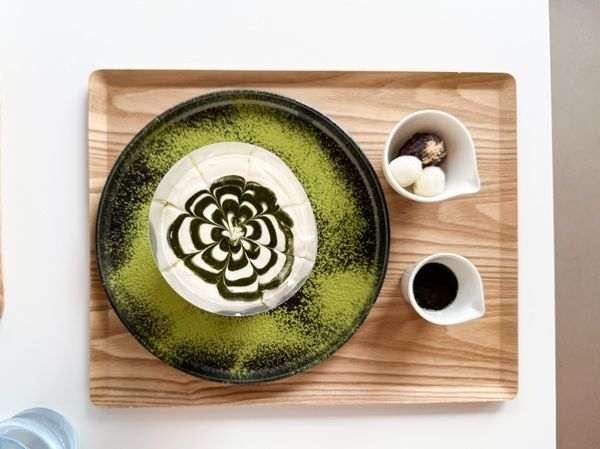 こちらは、宇治抹茶の花咲くパンケーキです。 パンケーキを囲ってあるフィルムを外すと、クリームが雪崩を起こし、お花が開いたようになります。 抹茶の香りとほろ苦さが、クセになりそう! ここには写っていませんが、デザート系のパンケーキを注文すると、グリーヨーグルトかアイスクリームが付いています。