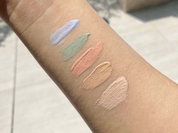 右から:エクセル エシリアル セラムコンシーラー ER01 ブライトベージュ、同 ER02 ナチュラルベージュ、同 ER03 アプリコットピンク、同 ER04 ミントグリーン、同 ER05 アイシーブルー(限定)