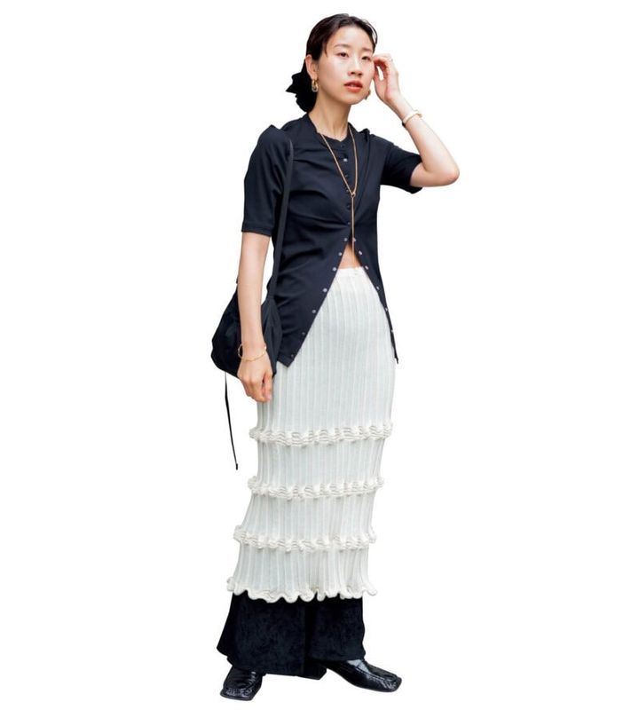 「伸縮性のあるニットスカートと、ややゆとりのあるワイドパンツでちょっぴり攻めのボトムレイヤードに。全体をモノトーンに徹することで、大人っぽさを香らせます」