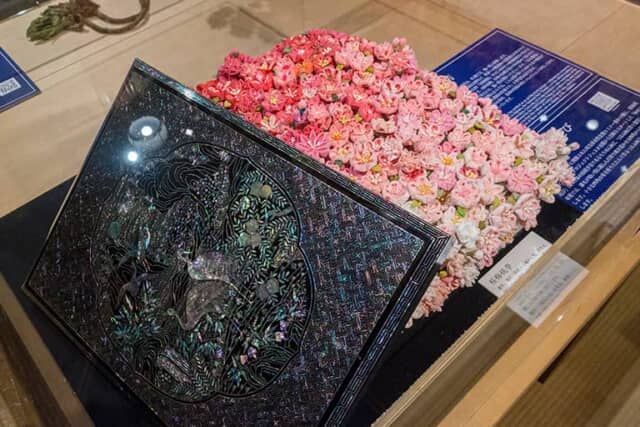 ▲螺鈿細工が施された漆の器に飾られるのは、つまみ細工