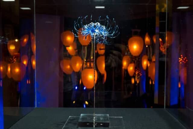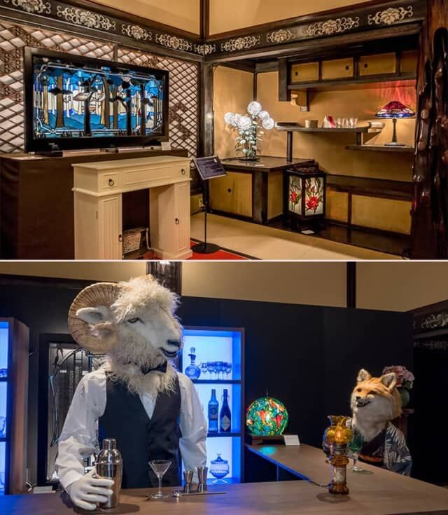 文化財「百段階段」を上り続けた最後の2部屋は鬼が去った世界が舞台。特に6番目の清方の間には灯りがともり、新たな文化が花開き、ガラス細工やかんざし、ガラスランプなど、美しい工芸品が飾られています。