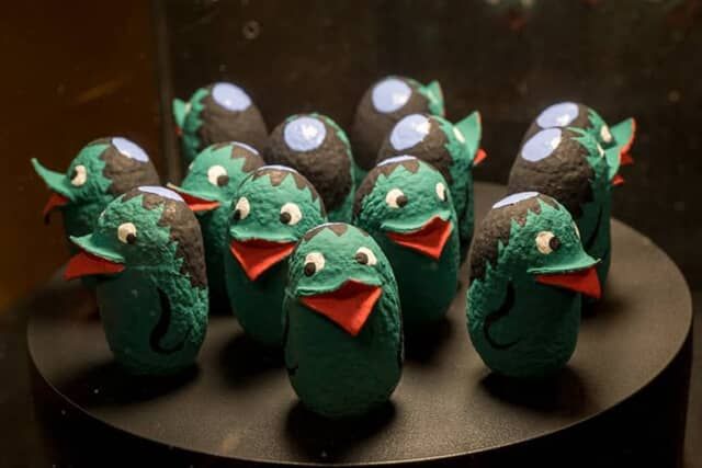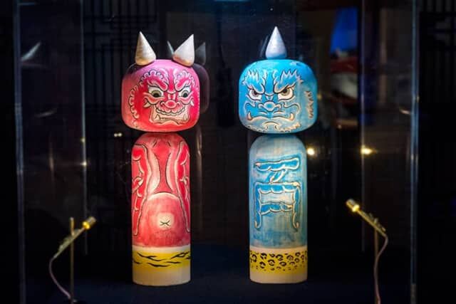 迷宮のような鬼の住処となった「草丘の間」は、美しくも妖しい世界。林 貴俊氏が立体的に彩色した赤鬼と青鬼のこけしは阿吽を表現しています。東北地方にはこけしの名産地が点在していますが、東日本大震災で被災した石巻では林氏が2015年3月11日に創業。伝統的なデザインにくわえ、形にとらわれないモダンでユーモアあふれる “石巻こけし” を制作しています。