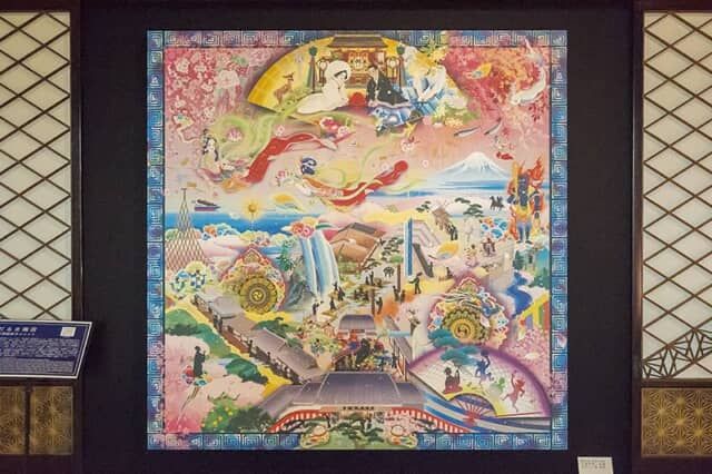美しい工芸品が並ぶ清方の間。注目は京都絵描きユニットだるま商店の『極彩色 目黒 山水 文雅抒情ノ末廣 花向ケノ宴 絵図』。人も鬼も宴に興じ、空には天女が舞い、婚礼が執り行われます。絵図の下中央はホテル雅叙園東京のエントランスと大屋根が描かれ、その左手には文化財「百段階段」と宴会場が連なるほか、館内の様々な様子も描き込まれているので、ぜひじっくりと見てください。