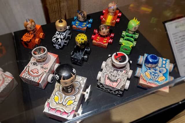 鬼や妖怪の群れが夜の都を徘徊する「百鬼夜行」。見た者は死ぬと恐れられた魔群の彷徨です。林 貴俊氏のこけしは、様々な姿かたちをした鬼こけしたちが車に乗って暴走するユーモア満点の作品です。