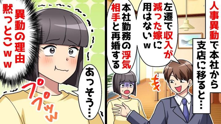 帰宅後、さっそく夫に報告すると、彼は即座に「郊外の支店に行くなんて左遷じゃん! 表向きはいいように言ってるだけだよ」と嘲笑。続けて、「当然、給料も減るんだよな? 最悪だ」と言い放ちました。