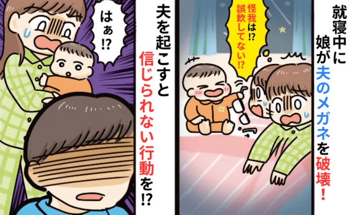 娘が生後8カ月のころ、就寝中に物音がしたので起きると、夫の枕元に娘が座ってメガネを持って遊んでいました。「遊んじゃダメだよ~」と取り上げると、メガネに違和感があることに気づき……。