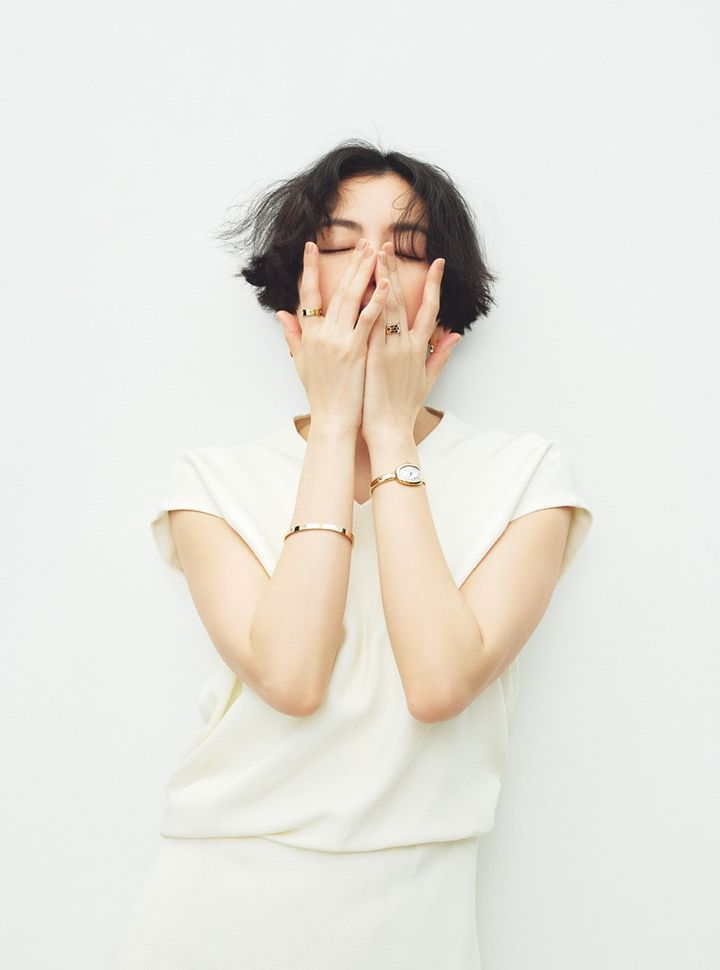 時計:〈ベニュワール〉[YG×クォーツムーブメント]¥3,088,800、リング:〈LOVE〉右手[YG×DIA]¥666,000、〈マイヨン パンテール〉左手[YG]¥478,500、イヤリング:〈LOVE〉[YG]¥814,000、ブレスレット:〈LOVE〉[YG]¥968,000(全てカルティエ/カルティエ カスタマー サービスセンター)、ドレス¥132,000(トゥモローランド ビー/トゥモローランド 渋谷本店)