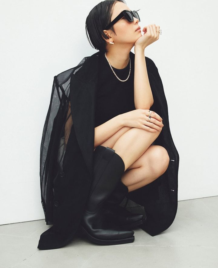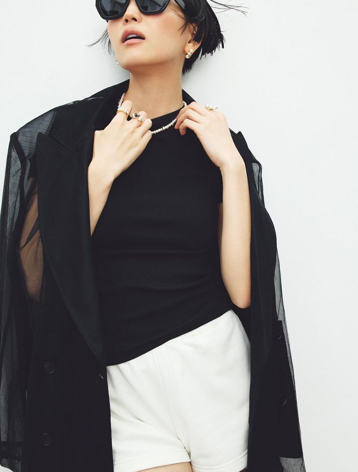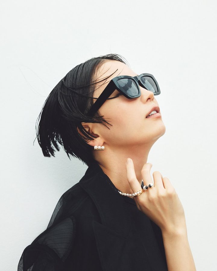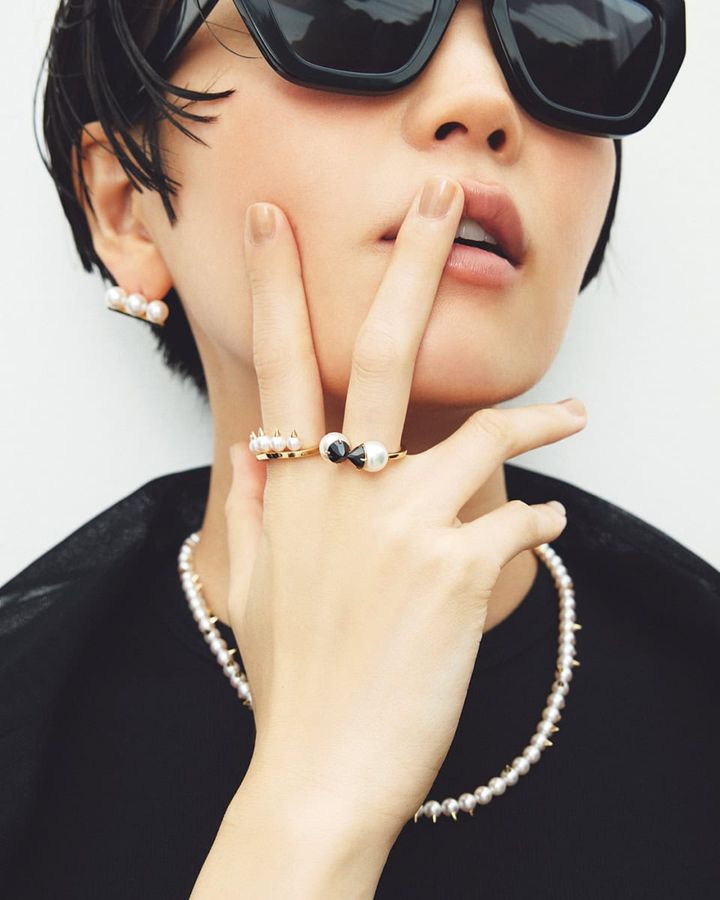 ネックレス:〈デインジャー〉[YG×あこや真珠]¥1,058,200、リング:〈デインジャー プラス〉右手人さし指[YG×あこや真珠]¥376,200、〈リファインド リベリオン シグネチャー ブラックスピネル〉右手中指[YG×あこや真珠×ブラックスピネル]¥377,300、〈バランス プラス ネオ〉左手人さし指[YG×あこや真珠]¥440,000、ピアス:〈バランス ネオ〉[YG×あこや真珠]¥429,000(全てTASAKI)、ジャケット¥30,800(プランクプロジェクト/プランクプロジェクト 青山店)、Tシャツ¥8,800、ショートパンツ¥11,000(共にカルバン・クライン/カルバン・クライン カスタマーサービス)、サングラス¥16,500(ステータス アングザエティー/ジャック・オブ・オール・トレーズ プレスルーム)、ブーツ¥132,000(ウォンハンドレッド/エイチ ビューティー&ユース)