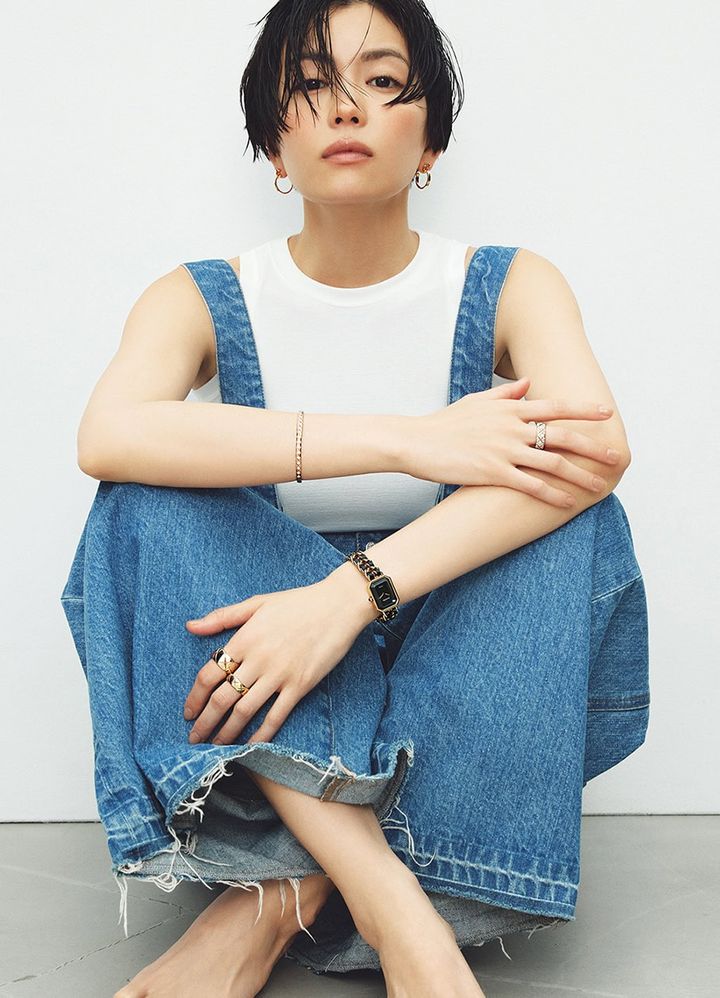 時計:プルミエール エディション オリジナル[SS(K18YGプレーテッド)×レザー×クォーツ]¥1,045,000、リング:〈ココ クラッシュ〉右手[BG×DIA]¥2,849,000、左手人さし指[BG]¥693,000、左手中指[YG]¥489,500、ピアス:〈ココ クラッシュ〉[YG]¥742,500、ブレスレット:〈ココ クラッシュ〉[BG×DIA]¥2,563,000(全てシャネル)、タンクトップ¥18,000(TW)、デニムサロペット¥33,000(プランクプロジェクト/プランクプロジェクト 青山店)