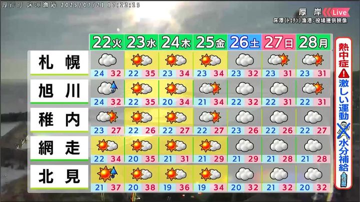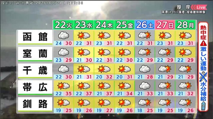 金曜日にかけて強い日差しと厳しい暑さが続きます。函館や室蘭でも真夏日、釧路も25度以上の夏日です。周りの人にも声を掛けてみんなで熱中症を防ぎましょう。