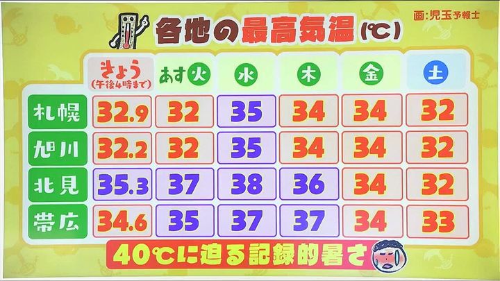 ちなみに北海道の7月の気温の記録は38.4度なので、それを超えるおそれがあります。体調管理に気を付けて下さい。