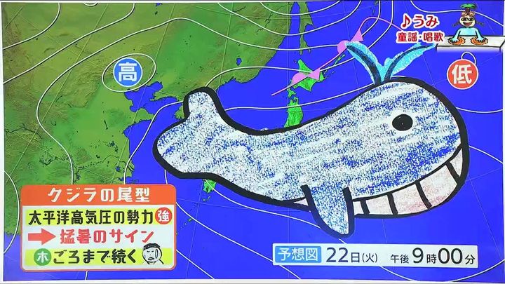気象予報士の間では「クジラの尾型」と言われていて、太平洋高気圧が日本海にまで勢力を強めるこの形は「猛暑」のサインなんです。