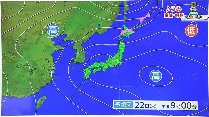こちらはあす22日(火)夜9時の予想天気図ですが、きょう21日(月)は海の日ということで、海にちなんだ「ある物」が隠れています。なんでしょう?