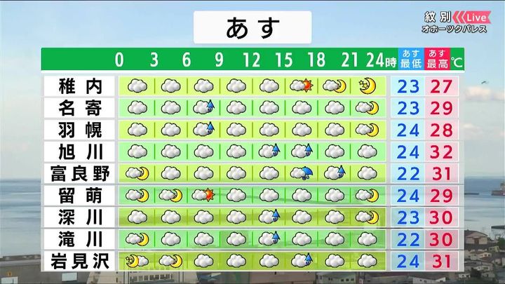 日中は旭川や富良野など内陸を中心にザっとにわか雨があるでしょう。気温は海岸部でも30度近くまで上がります。室内でも風通しをよくしてください。