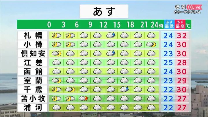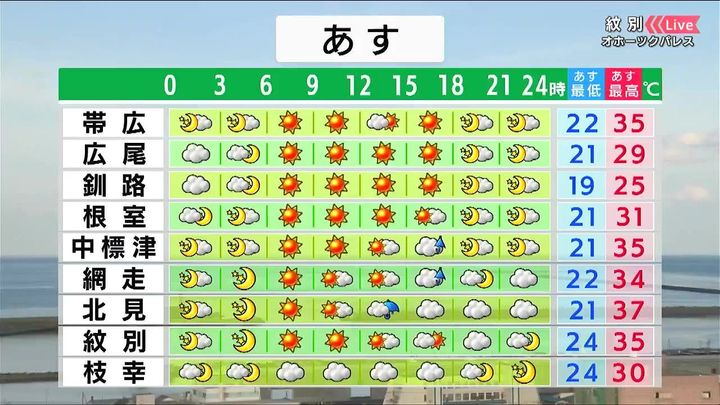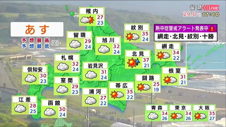 日中は内陸などでにわか雨があるでしょう。最高気温は30度前後で、帯広35度、北見は37度です。そして、網走、北見、紋別、十勝地方に熱中症警戒アラートが発表されました。少しでも涼しい環境で過ごしてください。