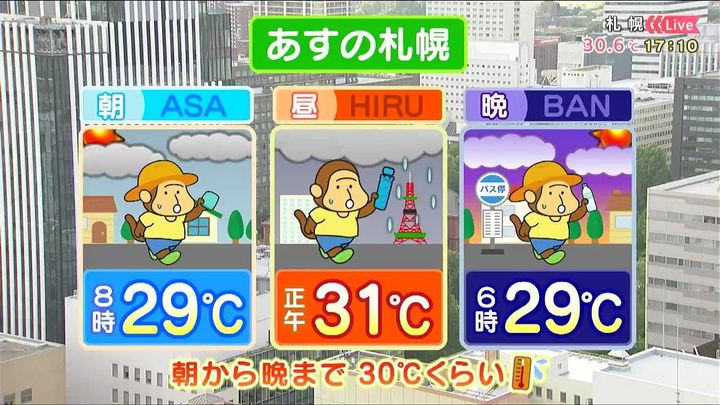 朝から夜まで気温は30度くらいですね…暑い時間が長く続きます。昼頃はにわか雨もあって、蒸し暑くなるでしょう。天気の変化、厳しい暑さに注意して下さい。