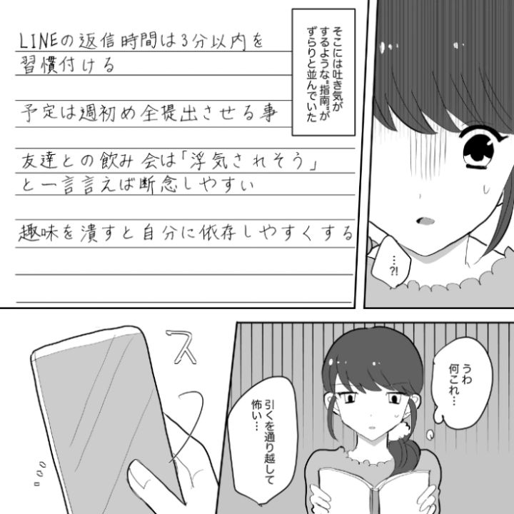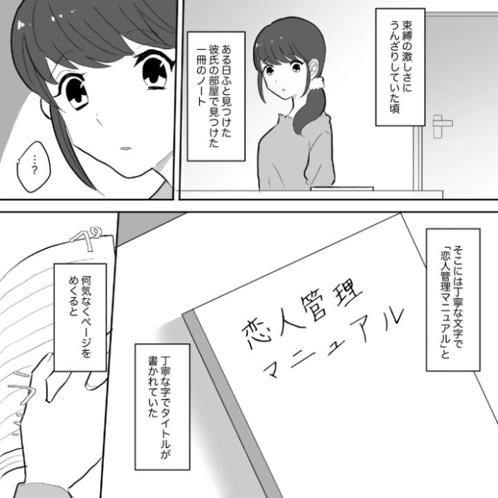 衝撃のエピソードを漫画化!今回は束縛彼氏と付き合っている主人公が彼氏の部屋で〝恋人管理マニュアル〟を見つけたお話をご紹介します。その内容が恐怖すら感じるものだったので友達に相談してみたら・・・。