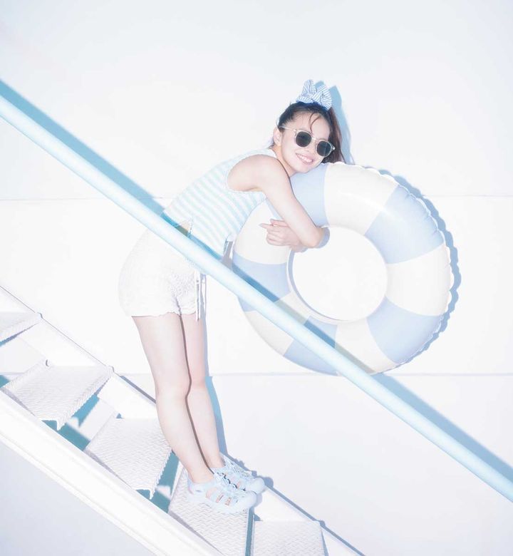 上國料萌衣。ar7月号より トップス¥16,500/ファーファー ショートパンツ¥2,499/H&M (H&M カスタマーサービス) サンダル¥15,400/キーン(キーン・ジャパン) シュシュ¥550/ウィゴー サングラス/スタイリスト私物