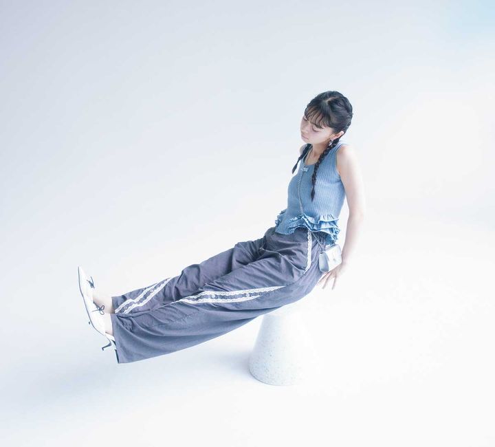 淡いブルーとグレーは相性抜群の組み合わせ。トップスのティアードフリルやボトムのレースデザインなど、ひとくせ効いたアイテムを組み合わせて、程よく個性をプラス。
