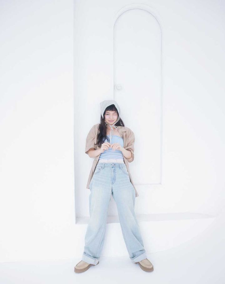 上國料萌衣。ar7月号より ジャケット¥11,000、 デニムパンツ¥17,380/マウジー(バロックジャパンリミテッド) チューブトップ(カットソーセット)¥4,950/リミュ(リミュプレスルーム) バブーシュカ¥3,300/オーバーライド(オーバーライド神宮前) 靴¥3,080/カミナンド(グラビテート)