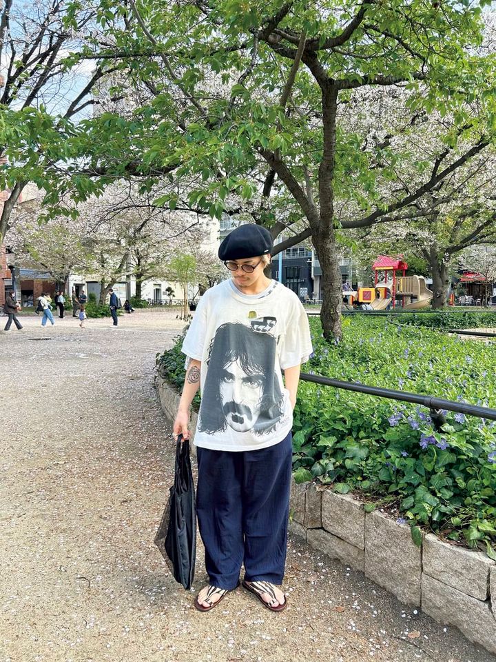 アメリカのシンガーソングライター、フランク・ザッパのTシャツは、ホールを使ってレイヤードが楽しめます。薄いブラウンレンズやゴールドフレームのサングラスは、古着に合わせても野暮ったくなりません。