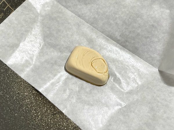パッケージ裏面にあるように、すこし水を切ったお豆腐をフライパンにクッキングシートに乗せて、焦げ目が付くまでソテーしてみました。