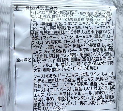 材料は、フォアグラ豆腐は、豆乳をベースにビーフエキスや、トマト、ローストオニオンやマッシュルームなどが入っているようです。そして添付のソースにはワインやしょうゆ、しいたけエキスなど、美味しいどころが揃っています!