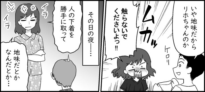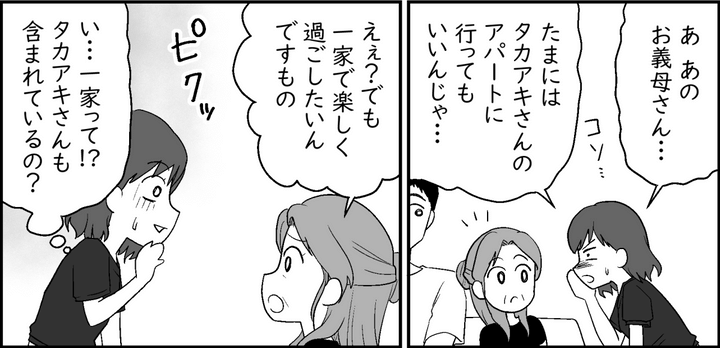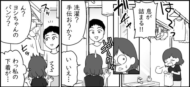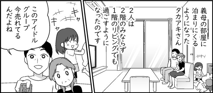義母の恋はますます盛り上がり、タカアキさんは頻繁に義母の部屋に泊まるようになりました。それだけではなく、なぜか私や子どもたちがいる1階にも現れるようになったのです。子どもたちが近くで見ているのに、リビングでイチャつく2人に開いた口がふさがりません。まるで自分の家のように過ごし、勝手にうちの洗濯物を手に取るタカアキさんのデリカシーのなさにもアゼンとしてしまいます。