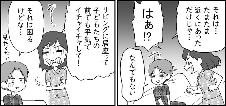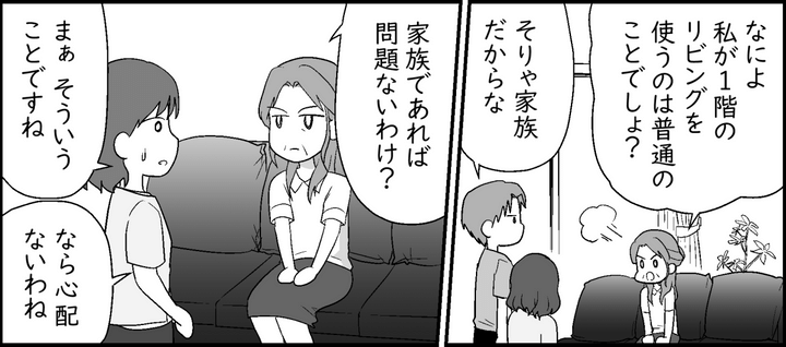 1階のリビングでテレビを見ながらイチャつく2人。娘と息子は珍しいものでも見るかのように、近くでそれを眺めています。「あの、お義母さん。テレビ、2階にもありますよね?」たまらず私が声をかけても、義母が気にする様子はありません。