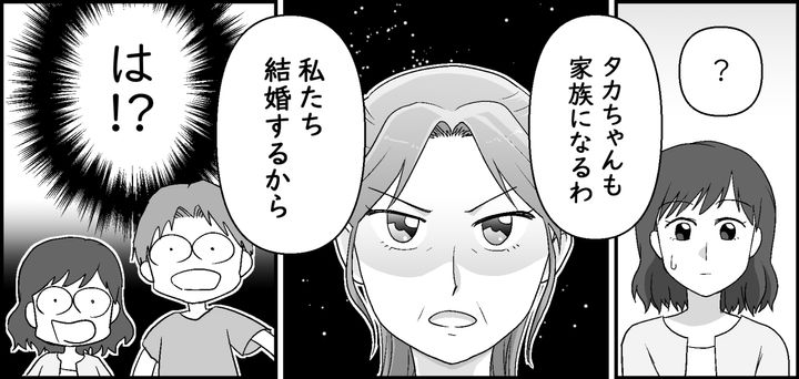 さすがに旦那に訴えて、「せめて2階で過ごしてほしい」とお願いしてもらったのですが……。義母の口からはタカアキさんとの、まさかの結婚宣言が飛び出したのでした。