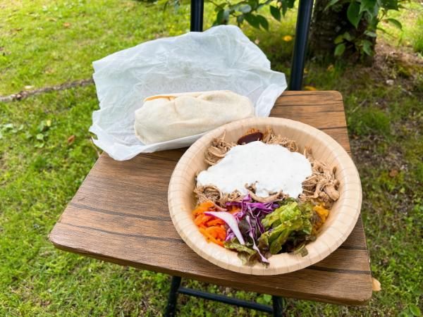 建物を抜けた先の軒下には、日替わりで飲食店が4店舗出店していました。 どの店舗も広島の人気店ばかりで、こちらも行列ができています。 どれも魅力的で悩みましたが、銀山町に店舗がある「Morgan(モーガン)」でチキンライスとラップサンドを購入。 チキンライスはスパイシーで暑い夏にぴったり、ラップサンドは万人受けする甘塩っぱい味で、どちらもとても美味しかったです。